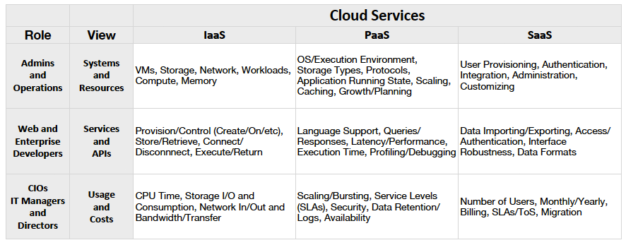 With all of the Cloud Viewpoints and multiple definitions of XaaS (IaaS, PaaS, SaaS) there should not be a surprise that there is a lot of Cloud Confusion out there. So how do we summarize the viewpoints? I think the easiest way is by separating things into 3 defining summary views – Systems and Resources, Services and APIs, Usage and Costs. Below is a table that shows how each of the summary views aligns with the generalized categories of XaaS.
