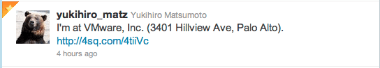 It appears that VMware is looking at Ruby (or at least they are talking to Yukihiro Matsumoto – @yukihiro_matz on Twitter) as seen in this FourSquare Checkin screenshot below: