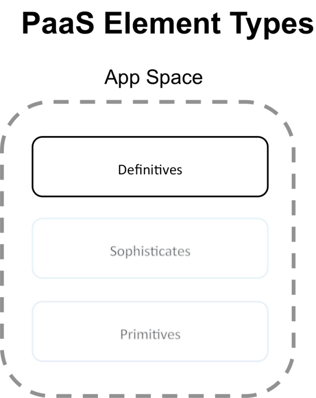 These abstractions allow complex configurations of Primitives and Sophisticates coupled with Application Logic, Dynamic Configuration capabilities, and more.  Definitives are the live and fully implemented abstractions as they consume resources.  This could be a Schema in a RDBMS or a Collection with Documents in it in a Document Store.  Definitives are where all of the specificity occurs in PaaS and ultimately what differentiates applications from each other once they are running.