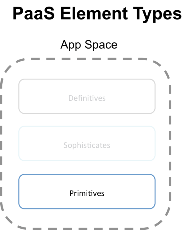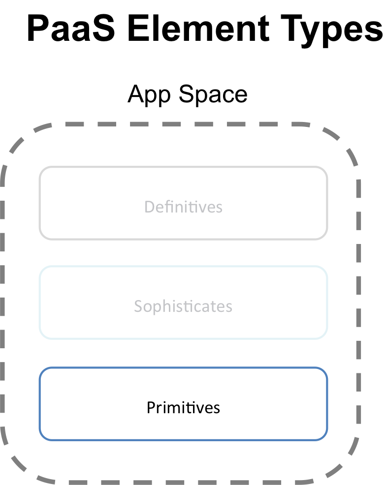 Primitives are the Core Building Blocks of Resources.  What does this mean?  Primitives cannot be reasonably reduced to a more basic/granular bit of functionality.  You may be thinking that an Operating System could most certainly be reduced to a more simplistic bit of functionality and you would be correct if we were talking about us in a traditional Infrastructure, but not PaaS.  Part of the magic of PaaS is the prescriptive nature that PaaS brings, along with the obfuscation in most cases of components such as the Operating System.  In the case of the Operating System, it is also important to recognize that as a Primitive, the OS has not actually been instantiated (it isn’t a running OS).  One final note is that PaaS eliminates nearly all direct ties between code and the OS (There are still limits imposed by the runtimes, etc. which are difficult to avoid – e.g. Mono for .Net support on Linux)