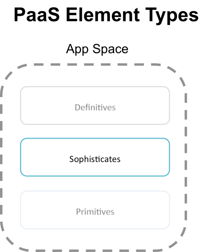 Sophisticates are built from Primitives, meaning that a Sophisticate cannot exist unless it is backed by a Primitive with some addition, change, or a second PaaS Element Type such as a Primitive or Sophisticate.  A Sophisticate could be built from a combination of another Sophisticate and a Primitive!  Let’s take RDBMS as an example (note that this would just as easily apply to NoSQL solutions, etc).  RDBMS will likely leverage a RuntimeVM, an Operating System, Processes, an Interface, Block Store, Cache, and a File System.  While this may be complex it is hidden by the RDBMS Interfaces, which is part of the beauty of PaaS is exposing this combination as a Service or Extension that can be consumed by an API call or a DB connection.
