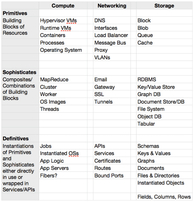 I also agree with you; After reading the two posts, I am not sure if Dave’s types fit the developer perspective or not. I do see Dave’s abstract model as a good start towards using a clean slate approach to redefine Cloud architecture. Whiteboard architecture is hard to convey in two short blog posts. When infrastructure level details are mentioned without specifying encapsulation points, the architecture model starts to leak. In the post, definitives are defined as “Instantiations (Running) of Primitives and Sophisticates either directly in use or wrapped in Services/APIs creating easily leverage abstractions.” But the example table doesn’t explicitly specify linkages and separation of concerns.